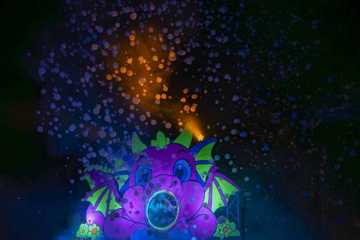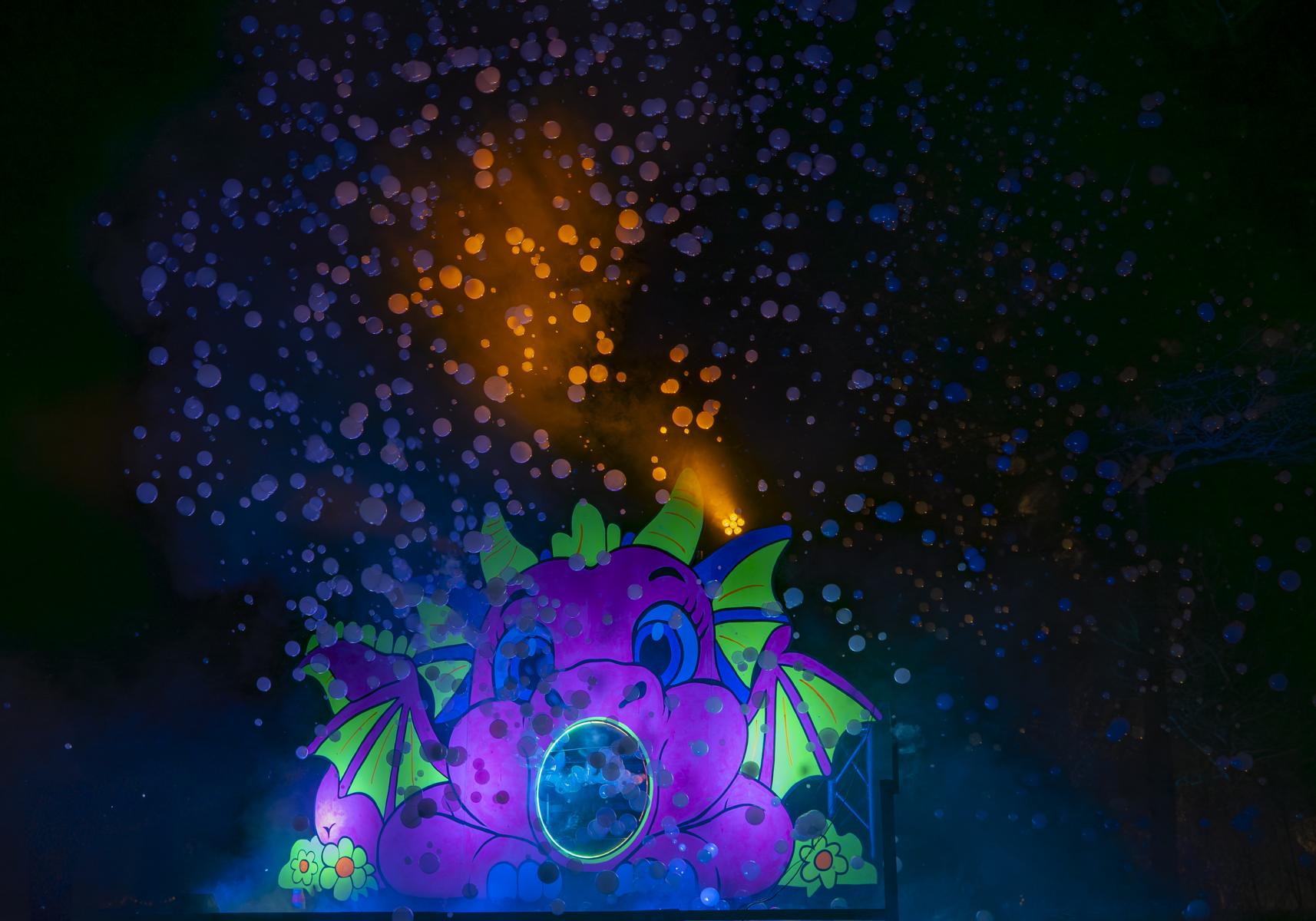 💡💡Nur für Kinder? Von wegen: Am Lichtspielplatz Kids-Corner in der LGS locken leuchtende Bauklötze, Einhörner, ein Seifenblasen speiender Drache, ein interaktives Wasserrad und mehr.