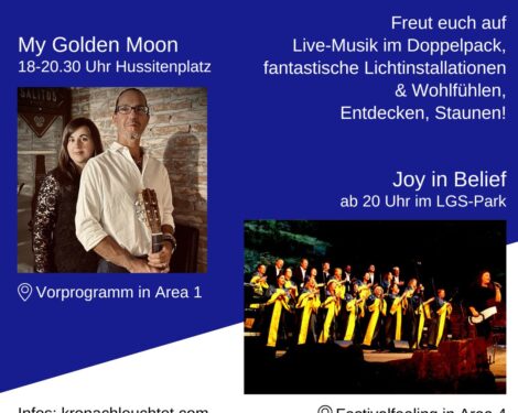 Wieder strahlt die Sonne und wir freuen uns auf den 2. Abend! Selbstverständlich wieder mit Live-Musik im Doppelpack: Der Gospelchor Joy in Belief lässt euch auf der Hauptbühne in der Landesgartenschau ab 20 Uhr aufhorchen.