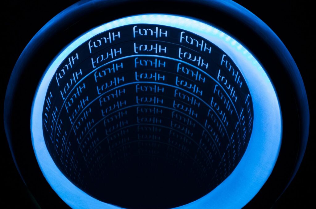 Dieses spannende Lichtkunstwerk beruht auf einem Spiel mit Typografie – die Künstlerin Daniela Faber verknüpft hier ihre Leidenschaften Licht und Grafikdesign. Aus kryptischen Zeichen formen sich bei genauerem Hinsehen die sich spiegelnden Worte „truth“ und „faith“. Jahresringen gleich setzt sich dieses Spiel scheinbar unendlich fort. Sanfte Farbwechsel und der Eindruck von Unendlichkeit lassen uns zur Ruhe kommen und öffnen den Raum, uns tiefer mit den verschiedenen Bedeutungsebenen der beiden Begriffe „Wahrheit“ und „Glaube“ zu beschäftigen. Welche Bilder und Themen tauchen auf? Welche Assoziationen werden geweckt? Wo docken diese beiden Begriffe ganz individuell bei uns an? Ist das, was ich glaube, wirklich wahr?