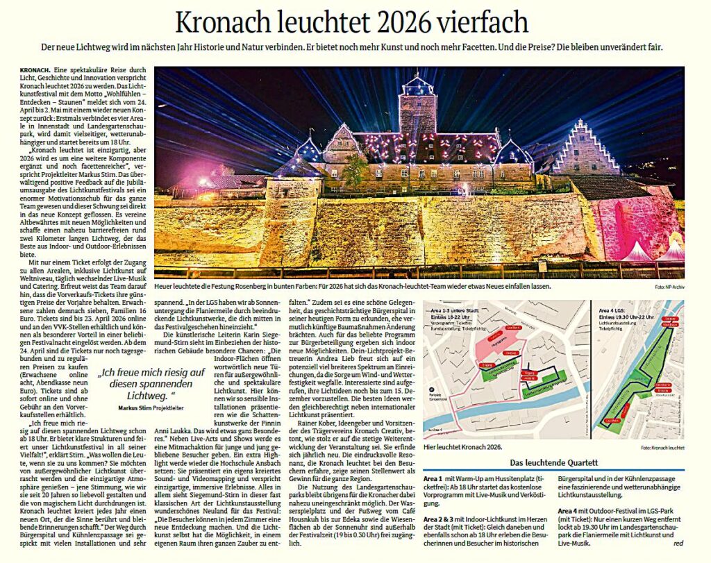 "'KRONACH leuchtet ist einzigartig, aber 2026 wird es um eine weitere Komponente ergänzt und noch facettenreicher!', verspricht Projektleiter Markus Stirn. Das überwältigend positive Feedback auf die Jubiläumsausgabe des Lichtkunstfestivals sei ein enormer Motivationsschub für das ganze Team gewesen und dieser Schwung direkt in das neue Konzept geflossen. Es vereine Altbewährtes mit neuen Möglichkeiten und schaffe einen nahezu barrierefreien rund zwei Kilometer langen Lichtweg, der das Beste aus Indoor- und Outdoor-Erlebnissen biete."