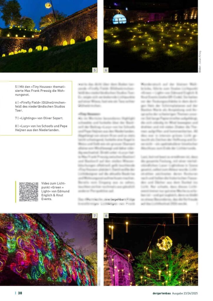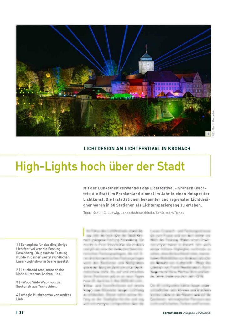 "Lichtinszenierungen sind auch ein beliebtes Medium für die Aussenraumgestaltung. Impulsgeber können Lichtkunstfestivals wie jenes in Kronach sein, bei dem Stars der Lichtkunstszene mitwirken."